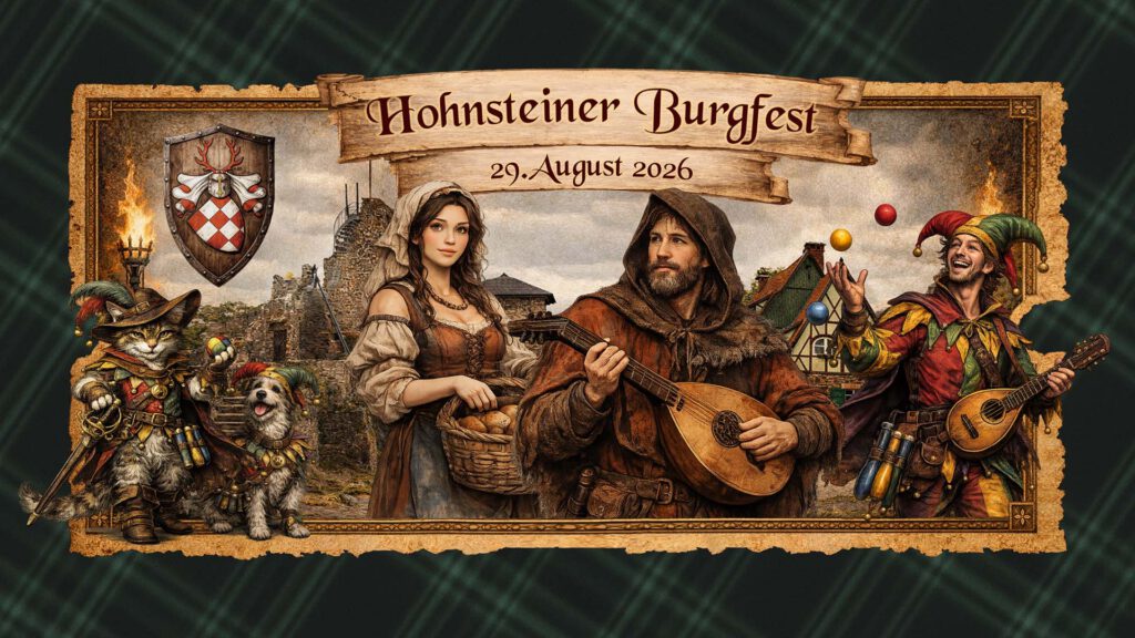 Das große Hohnsteiner Burgfest Ein Samstag zu Gast in einer anderen Zeit Wir suchen Dich!Dein Alter Ego ist Hexe oder Gaukler? Du bist Händler oder anderweitig… Burgfest 29.08.´26 weiterlesen - Ritteressen 13.06.´26
