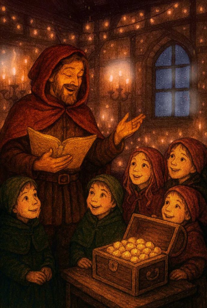 Und siehe da – aus einer geheimen Truhe, geschmückt mit goldenen Ornamenten, entsteigt eine süße Überraschung. Goldnüsse, glänzend und köstlich, werden den Kindern und den jung gebliebenen Herzen gereicht, als Zeichen, dass Märchen nicht nur erzählt, sondern auch geschmeckt werden können.